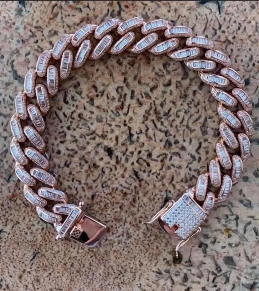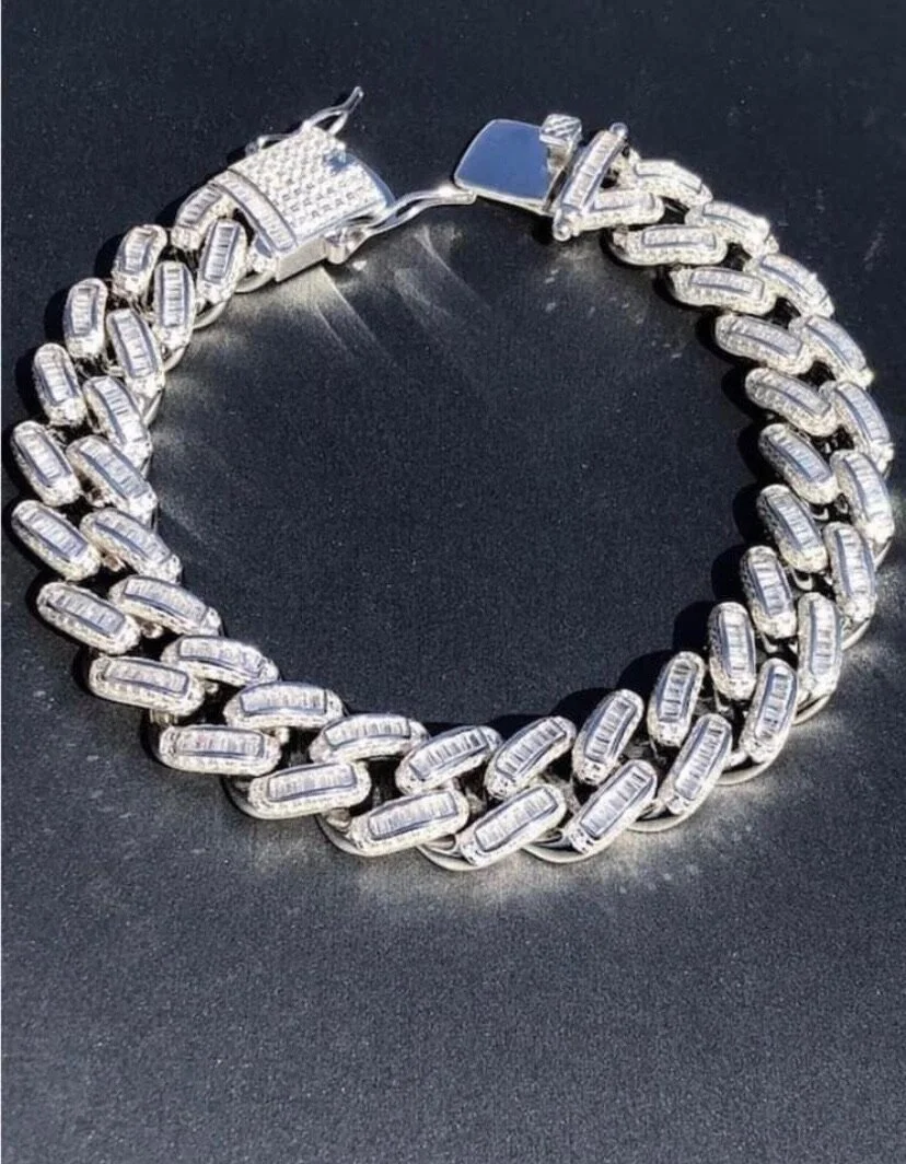 14k White or Rose Gold Cuban link bracelet. 15 carats of G color, VS clarity baguette diamonds. Available on order.