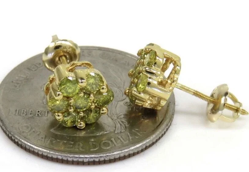 14k Yellow Gold cluster diamond screw back earrings. Available on order in multiple color diamonds.